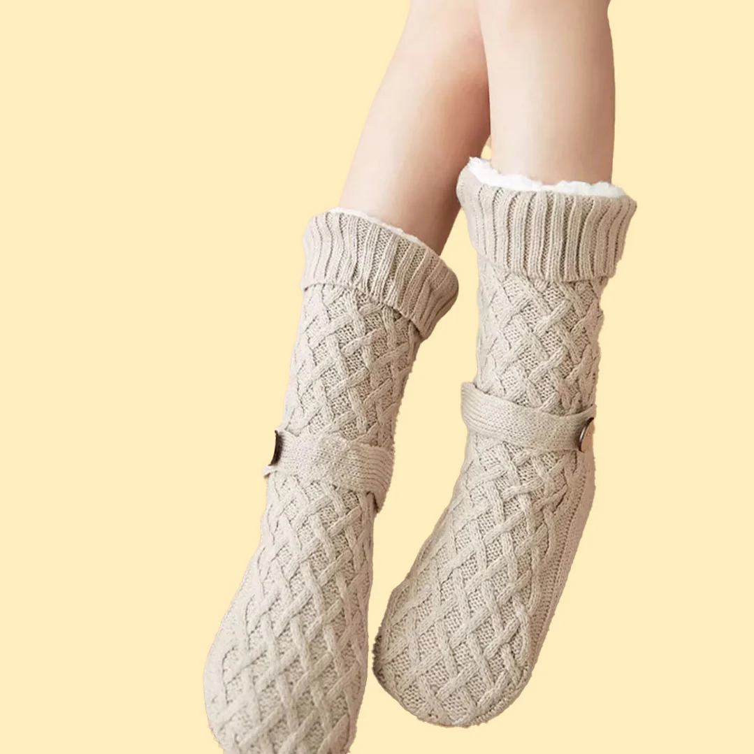 We love these new Cable Knit Super Warm Socks. They are so so pretty! We love the vibrant colours, the texture of the cable knit and that little wood button detail! The socks are lined with a thick wooly layer for the extra oooph of warm! There are anti slip studs on the bottom and you can lounge around in them ALL weekend long. There are so many colours to choose from~