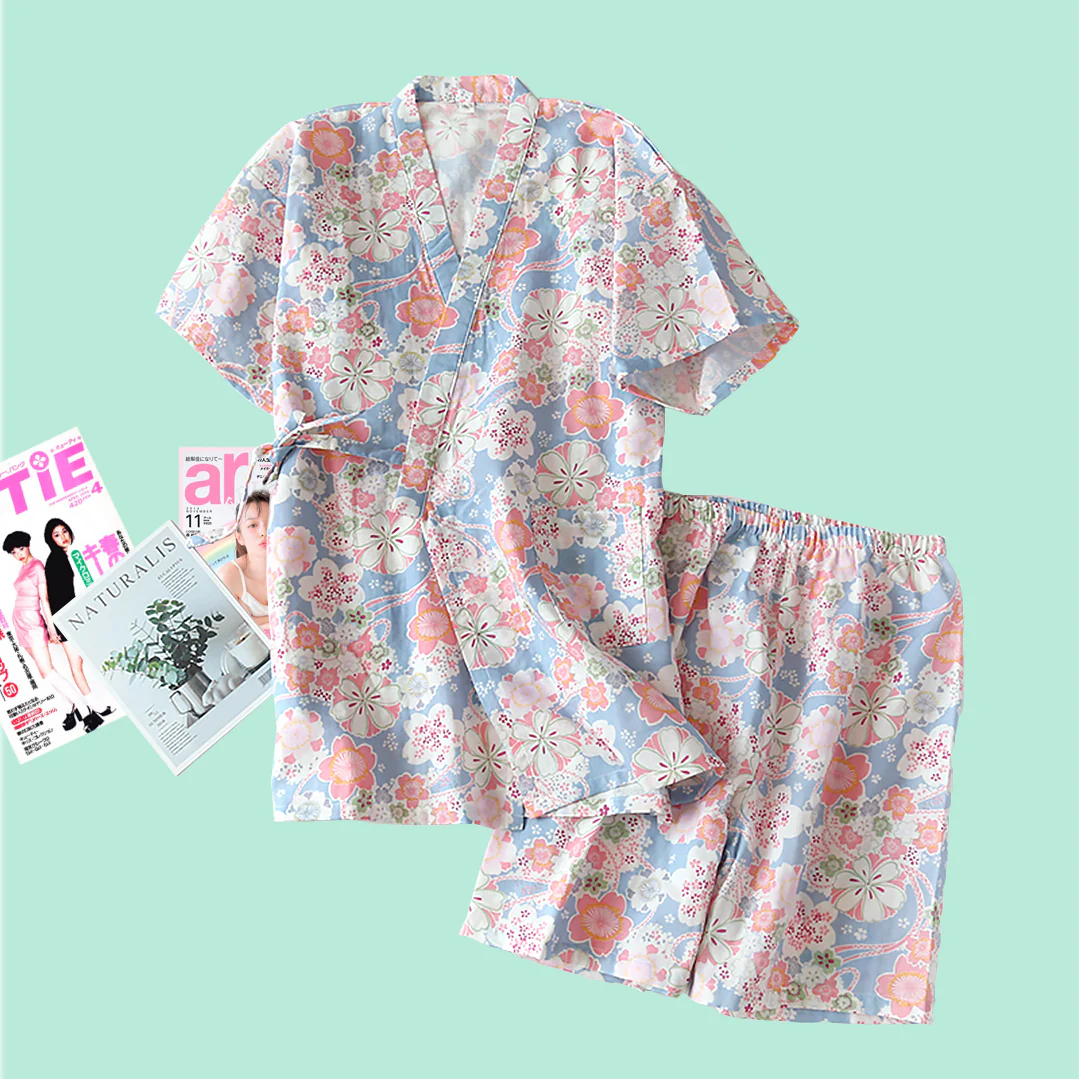 All pastel lovers, have we got a treat for you! This beautiful Hana Hana Kimono Pyjama Set is covered with kawaii Japanese blossoms. This is so much like the Yukata ~ a lighter kimono for the summer and full of floral design. Made of 100% breathable cotton and it will only gets softer and softer as time goes by.